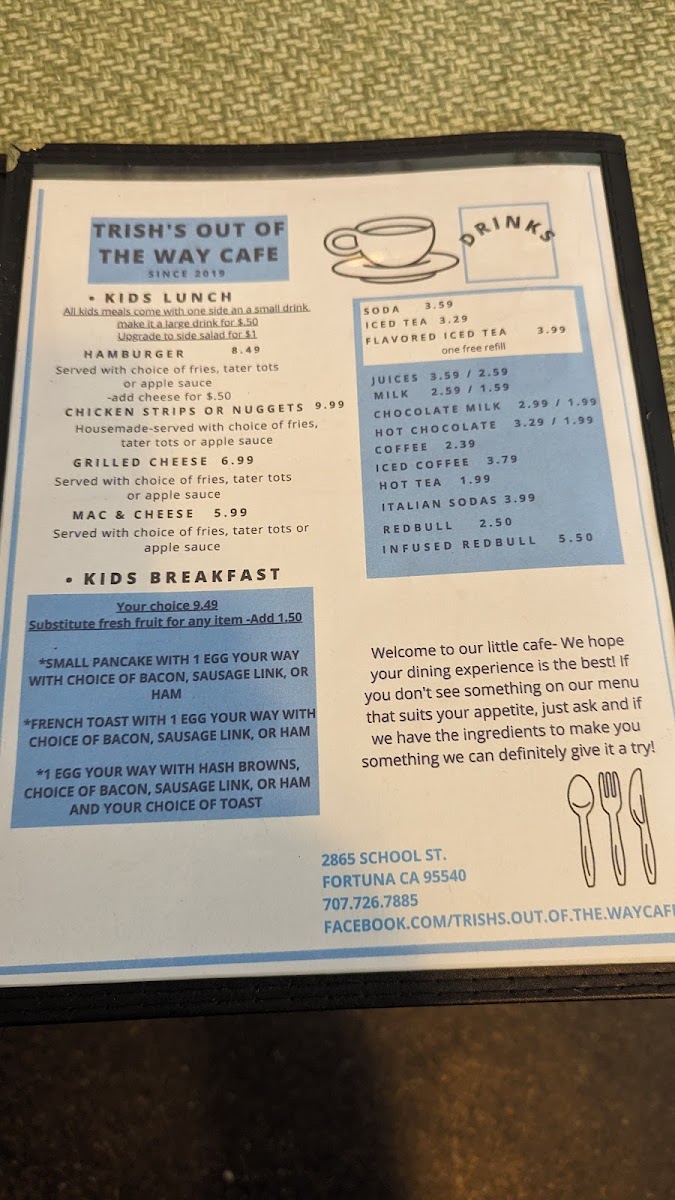 Welcome to Trish's Out-of-the Way Cafe, a hidden gem located in Fortuna, CA, where culinary delights await. The menu reflects a passion for quality, featuring hearty brunch classics with a twist.